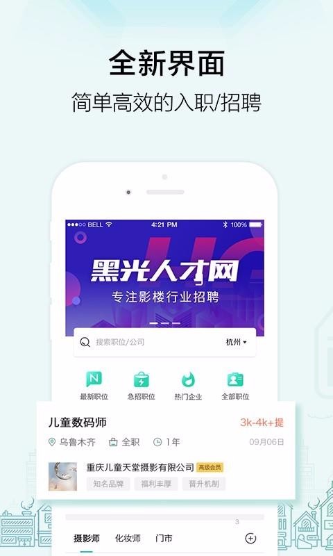 黑光人才网是专注于影楼行业的求职招聘,影楼行业可以在这里找到合适的人才,而求职者可以在这里找到心仪的相关工作;该软件中所有招聘信息都是经过人工审核的,杜绝虚假招聘,保障每一位求职者的利益;求职者可以在该平台中找到关于摄影师、化妆师、修图师、销售等相关职位,自行通过关键词来查找需要的职位,快速找到心仪的工作;当求职者浏览企业信息时,企业可以通过谁看过我,来查看有哪些人才查看过该职位,可以选择合适的人才来进行详谈;求职者也可以将建立设置为置顶,增加曝光度,为自己提供更多的工作机会。