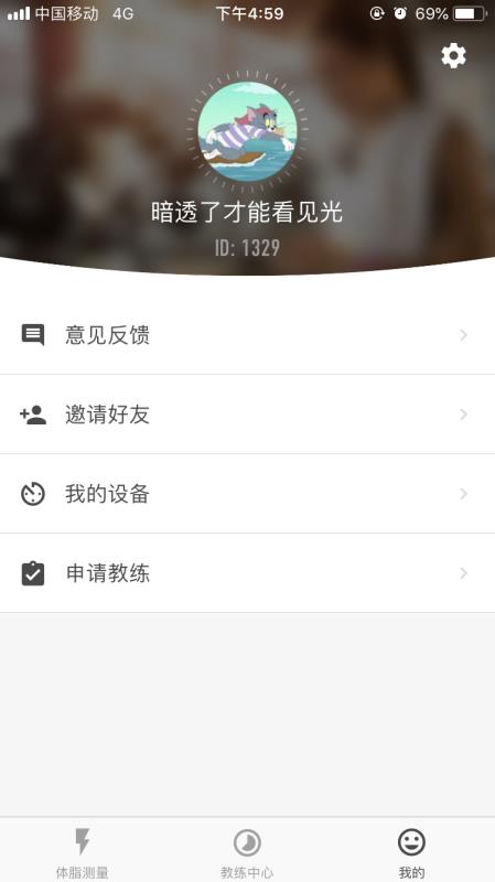 2、点击我的,可以选择的功能有意见反馈、邀请好友、我的设备、申请教练