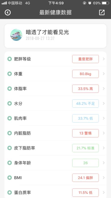 2、健康数据,该软件会根据相应的设备收集你的健康数据,包括肥胖等级、体重、体脂率、水分、肌肉率等;