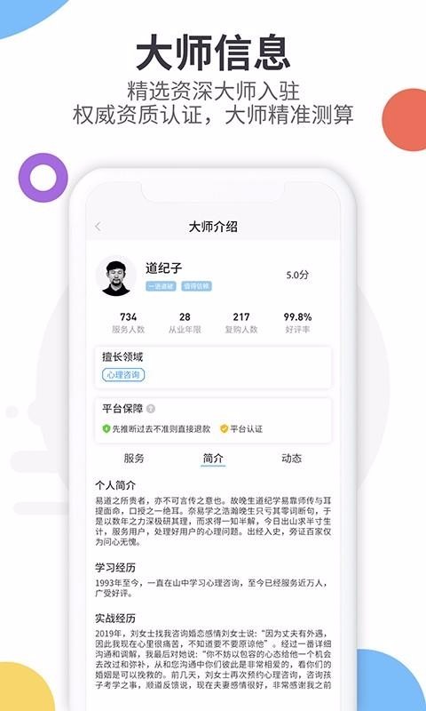 1、大师介绍:可以查看到大师的简介,平台是否保障认证,专业咨询;