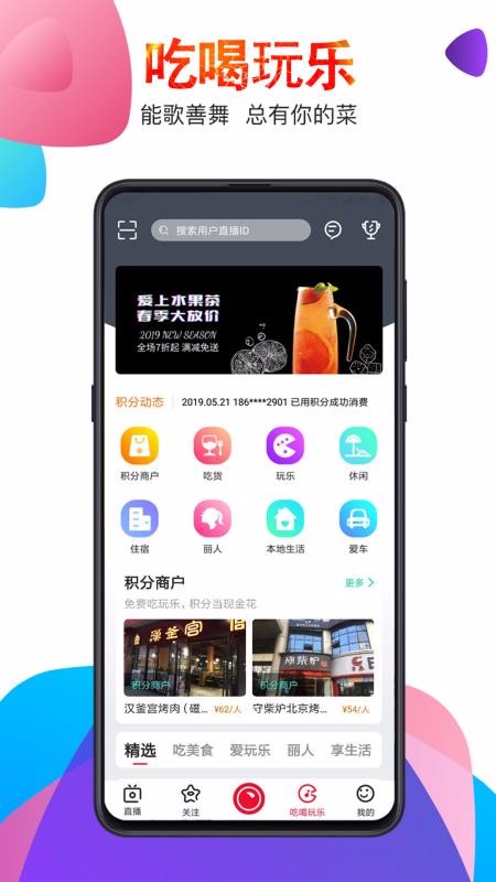 4、吃喝玩乐中划分了不同的专区,有休闲、玩乐、吃货以及积分商户等;