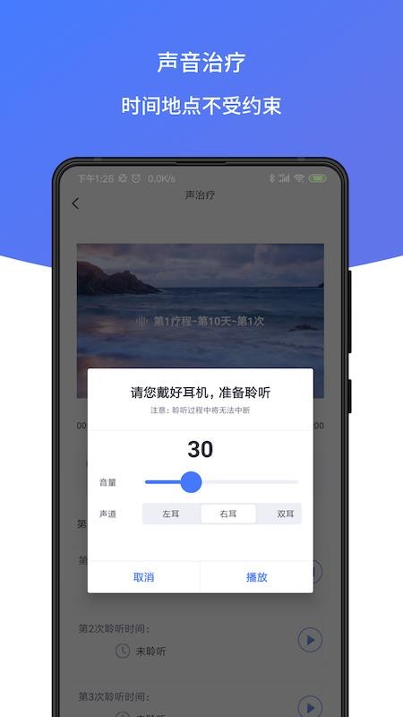 耳鸣声治疗是一款可以治疗耳鸣的软件,具有强大的治疗功能,能够帮助用户更好的治疗耳鸣情况,让你能够得到优质的服务,快速的提高治疗方式,更好的进行使用。平台里有专业的医生在线提供帮助,用专业的知识解决你的耳鸣问题,让你可以不用去医院就能够治好自己的耳鸣情况,为用户提供优质的服务。在使用的时候,平台会根据你的情况,为你推荐合适的音频进行聆听,改善你的聆听功能,帮助患者快速的缓解耳鸣,根据平台提供的疗程,让用户能够更好的进行使用,全面的治愈你的耳鸣情况,让你在平台里能够得到更多的帮助。