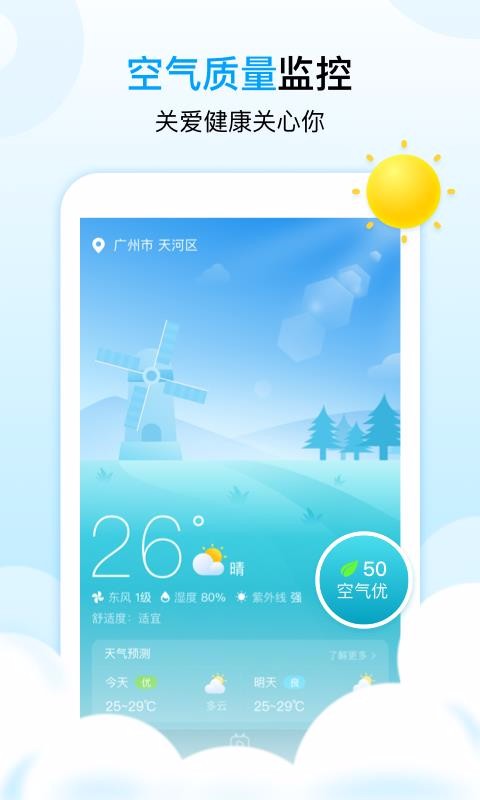 天气球app是一款智能化天气查询服务手机软件;这里可以查询精准的预测天气数据,监控空气质量,让你能够及时获悉,选择在较好的环境之下工作和学习;还能够为你预测未来十五天的天气情况,清晰的掌握帮助你对于接下来的工作行程出行等安排最好的时间,早日预防出行办事更加顺畅;这里还能为你建议更加舒适的生活方式,例如穿衣、旅行、洗车等,让你的这些生活中的大小事不会因为天气变化而受到困扰;二十四小时精准预报,还可以选择查看每个时刻的天气温度、风向等级的情况,真正是生活的好帮手,赶紧本站。