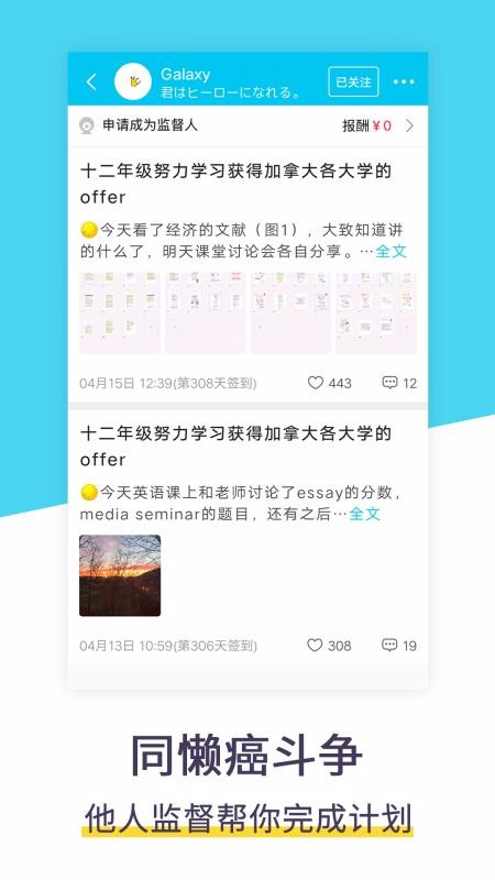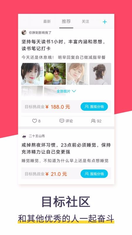 发起目标:发起一个目标计划,并缴纳一定的押金,邀请你的好友来监督你,其他用户也会加入对你目标计划的关注和监督。成功则返回押金,失败则押金分给围观者。