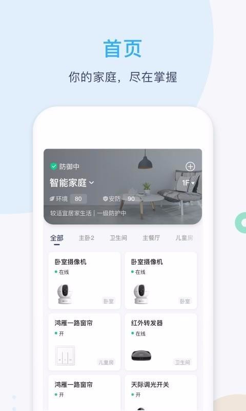 3、在首页,可以点击主卧、卫生间、主餐厅、儿童房等分类查看智能设备的运行情况