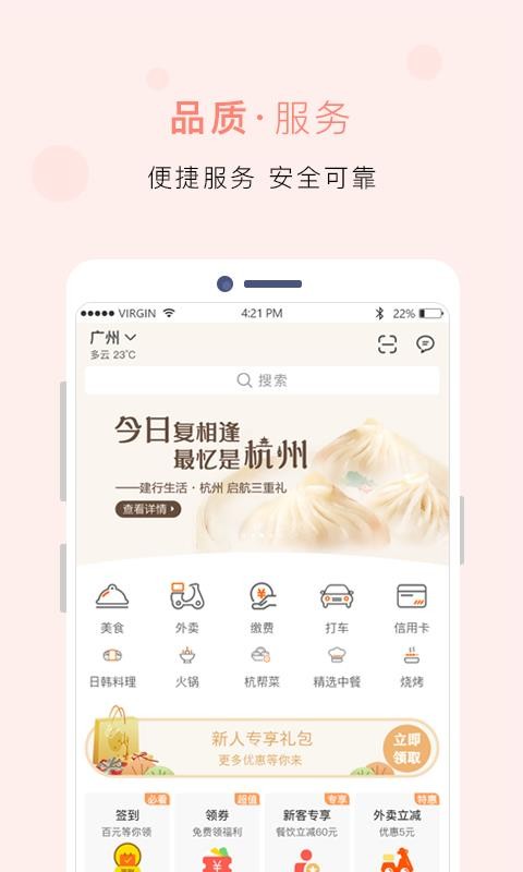 建行生活app是一款专门为当地提供便利的生活服务平台;这款应用能够帮助人们解决日常的所有服务,其中包括:优质的餐厅、品质的外卖、打车出行、充值缴费等服务无论您是否手持建行卡,只需要完成注册登录,即可享受一站式的服务;应用为了庆祝新人,推出了很多的优惠活动 ,专门针对于新人,新手只需要完成注册,就能够领取各种优惠券,让您买东西更加划算,还有线上点外卖,也能够享受立减优惠,让您更快捷实惠;此外,应用还能够对服务进行评价,当您收到外卖后,您就可以进行及时的反馈,方便店家作出及时的整改,也可以根据评级找到更多好吃的。