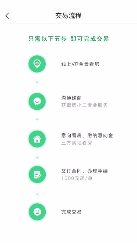 1、完善的交易流程,从线上看房、沟通磋商到意向看房与签订合同,再到完成交易,提供了一站式的服务;