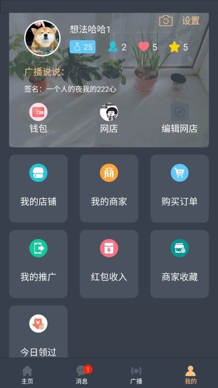 2、在我的页面,可以查看我的店铺、我的商家、购买订单、我的推广、红包收入、商家收藏等