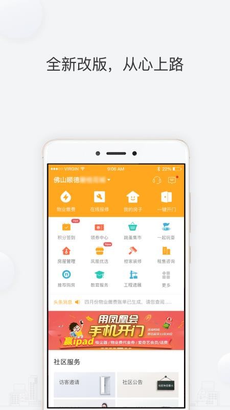 1.[新增]快捷入口,长按凤凰会图标可直达【手机开门】【物业缴费】【报事报修】【我的管家】功能页