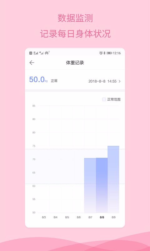 5、每天统计自己的体重,系统会进行数据监控,帮助孕妈妈监控身体的健康;