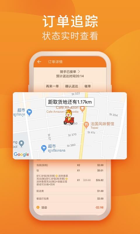 柬单点app是一个美食外卖配送平台,为用户提供中文、英文、高棉语三种语言,用户可根据自己的需求来自由切换你能够听懂的语言进行使用,让你体验到更便捷的服务;使用这个软件能够为用户提供非常便捷的外卖订购服务,用户可以根据自己的需求来选择你喜欢的美食进行下单,能够帮你快速找到自己喜欢的美食;平台提供的服务汇集了吃、喝、玩、乐、行等方方面面,能够做到一站式解决用户的各种生活服务需求,让你可以更便捷的使用这个软件来下单各种美食,感兴趣的话快来下载柬单点安卓版进行使用吧!