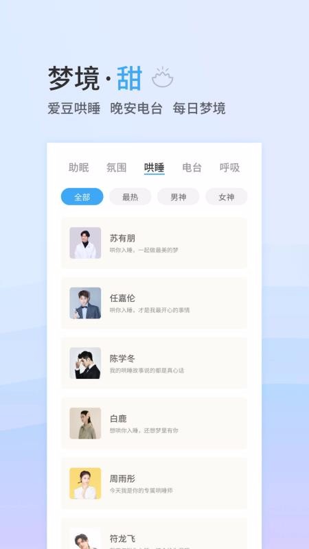 2、软件拥有晚安电台,每日梦境及专属爱豆哄睡,伴你夜夜美梦,给你一个好睡眠;