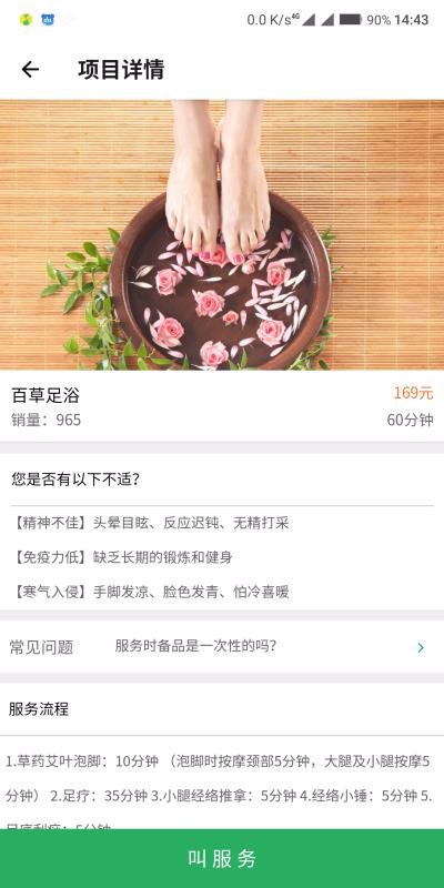 5、项目详情中介绍了丰富的详情内容,有症状栏提示项目的试用症状、服务流程明细等;
