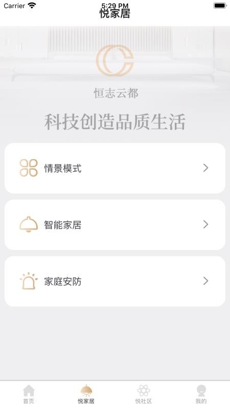 3、点击“悦家居”按钮,可以查看到情景模式等功能