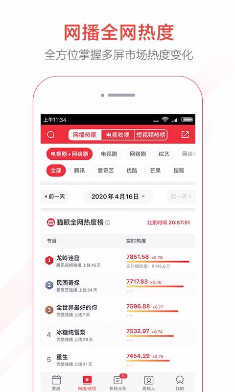 2、电视数据:每日不断实时显示网播热度,收视率,短视频热榜等更新迅速,还能根据平台逐个查看;