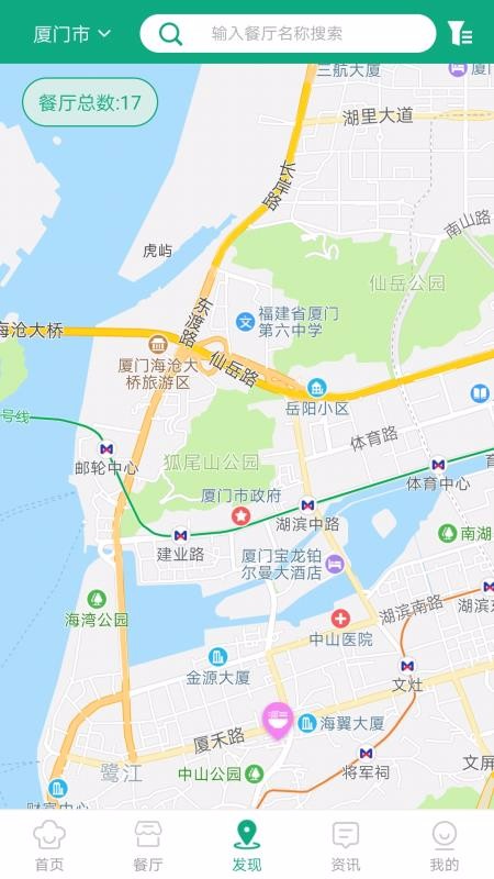 4、切换到发现中心,查看地图上展示的餐厅并查看数量统计