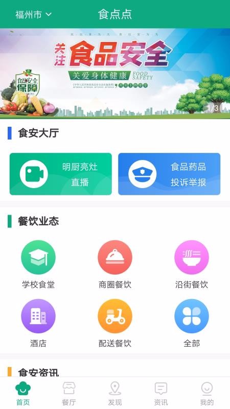 食点点是一个食品安全服务中心,可以在平台导航看到不同领域的餐饮业态信息,还能在食品安全资讯中阅读相关的食品安全资讯新闻;从发现页面可以看到附近的餐厅总数,直接在地图上展示了附近的餐厅位置区域,实现了对餐饮机构的位置监管,在该栏中还能切换到不同的城市中查看不同城市范围内的餐厅情况;资讯中心实时播报最新的热点食品安全资讯,这里可以看到市场监管总局办公厅发布的关于进一步抽查食品安全的工作报告,还能看到关于各节假日中针对节假日需要食用的商品的相关资讯播报,比如在中秋节的时候就会推送关于月饼包装等方面的新闻。