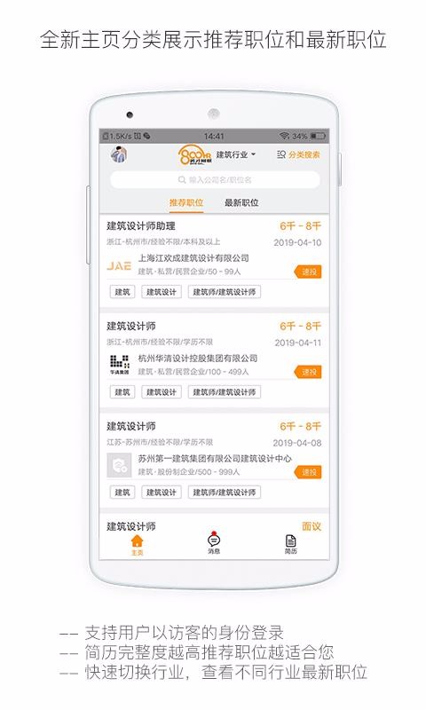 行业找工作是一款技术人才线上找工作的软件,此应用中拥有大量的工作岗位在线推荐,可以用户可以在平台上快速的找到合适的工作进行面试;在这里有行业选择功能,用户可以根据自己的行业在线选择合适的行业进行搜索,可以在平台上快速的找到对的工作进行咨询;还能在平台上将自己的简历进行编辑,一键轻松上传,就能快速的找到对应的工作进行面试;而且系统会将一些热门的工作进行推荐,可以在平台上轻松进行查看,了解工作性质;用户还能在平台上接收到系统发布的通知消息,及时对消息进行处理,赶快下载试试吧!
