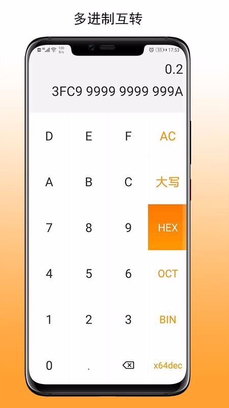 5.键盘右滑进入数值处理转换界面,(支持金额大写,支持32位/64位有符号二进制数转换)