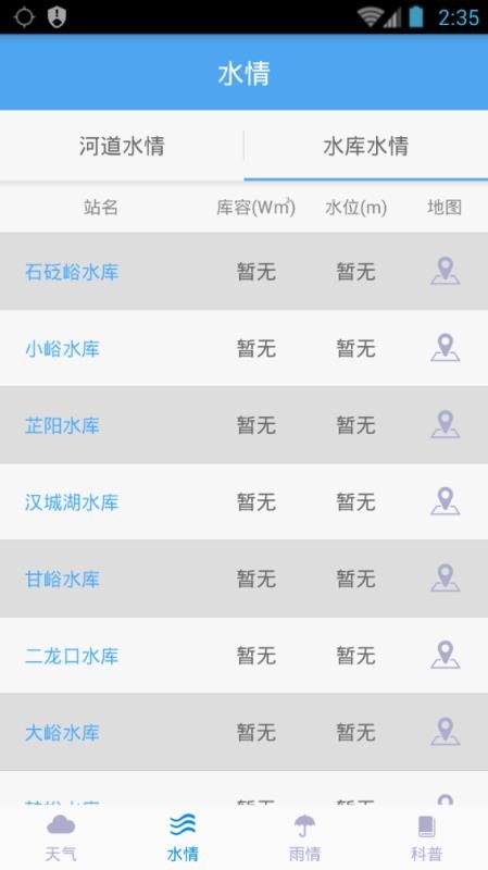 4、切换到水情界面,可以查看到河道、水库的涨水信息
