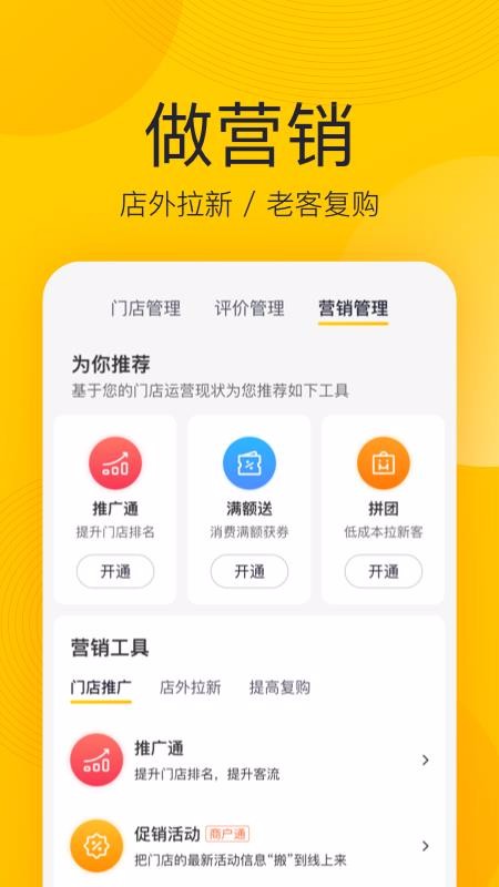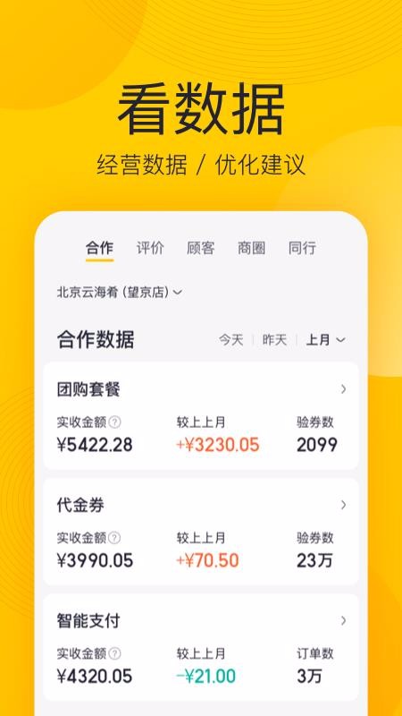 现在越来越多的人喜欢在美团上点外卖,足不出户也能解决吃饭问题,获得了很多用户的喜爱,小编今天为大家推荐的这款美团开店宝app是美团网出品的移动端美团商家平台app,提供了营销管、理整合收单、评价管理、门店管理、财务对账、会员营销、经营分析、行业资源等功能,它可以帮助商家直接触达7亿美团点评用户,对于想开店的用户来说,想要生意兴隆缺少不了美团开店宝app的帮助,有了它全面掌握经营技巧,经营难题不再愁。