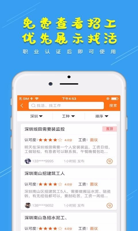 3、该软件优先展示招工信息,你可以按照地点、工种、排序等查找满意的工作;