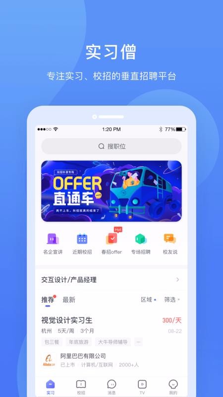 实习僧app是一款实习校招求职软件,这是一个专注实习的招聘平台,主要为还在学校的同学们提供各种实习的工作机会,为大学生创造更多的实习经验;它把各种实习岗位工作按照名企宣传、近期校招、春招offer以及专场招聘等专区进行分类,还能在校友说专区中学习到许多的关于工作与职场上的小知识;向学生们推荐了非常优质的实习岗位资源,比如视觉设计类的实习工作,该类工作一天可以拿到三百块钱的工资;每一个实习工作都标明了具体的实习时间长度,还能看到每一周工作的天数,从这些信息里面可以筛选出适合自己、自己也比较喜欢的实习岗位。