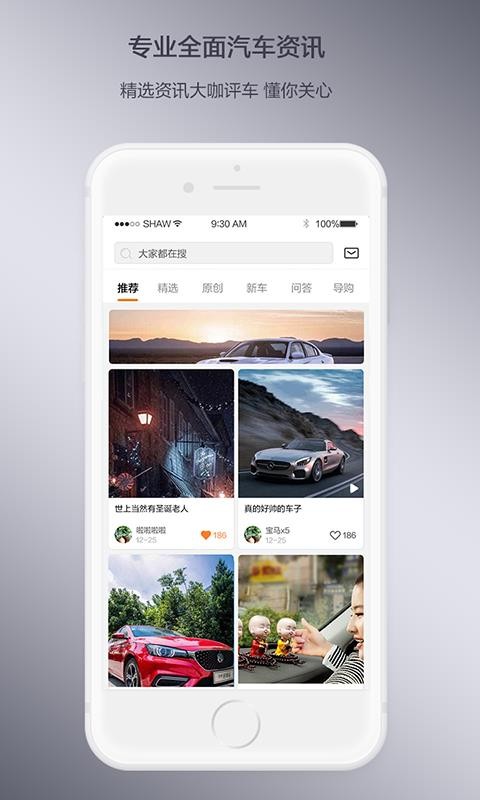 快看车app是为用户提供的一款手机汽车新闻资讯软件,这里能够为用户提供海量的汽车资讯信息,让您可以在这里了解到最新的车讯内容和行业动态;这里的内容非常的丰富,包括汽车全国报价、行业新闻、导购、评测、 用车、视频等多方面的资讯,让你在这里能够更好的对汽车进行了解;用户也可以在这里对喜欢的内容进行点赞评论,能够发表自己的想法,还能够根据用户的兴趣爱好为您自动的筛选出你喜欢的内容供您选择,更有专属的客服在线为用户提供咨询服务,你有任何想要了解的问题都可以在这里进行咨询,能够及时的为你解答。