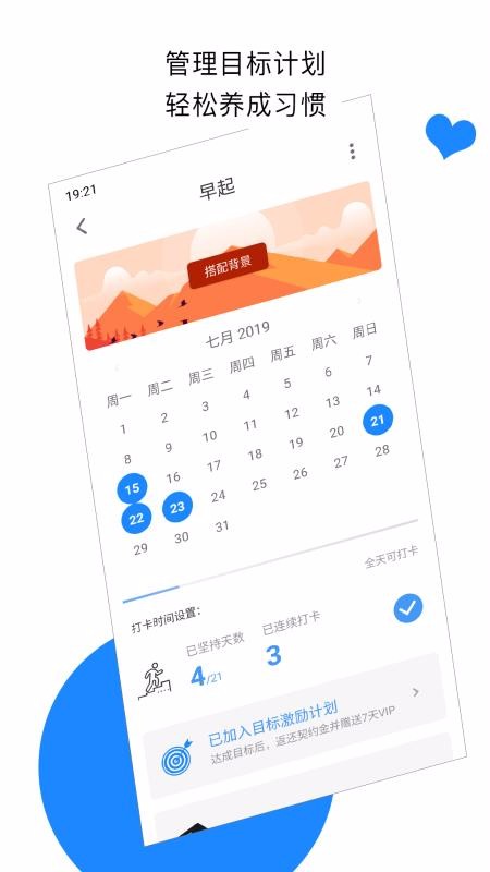 计划打卡app是一款非常不错的计划养成软件,它可以帮助用户提前制定好目标,坚持每日打卡,完成指定任务,在这样循序渐进的过程下,快速培养良好的生活习惯,其次,你不仅可以邀请好友来监督你,帮助你更快的实现目标,而且,还可以围观别人的事件,鼓励他们完成目标,操作上非常简单,新手也可以轻松驾驭,需要的小伙伴赶快下载试试看吧。