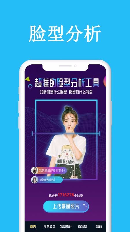 6、马上分析自己的脸型,在首页点击上传照片功能并款式扫描测试脸型;