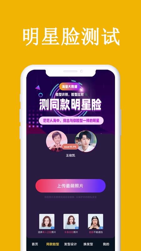 5、明星脸测试,支持在该测试中心上传自己的照片并测试和自己相似的明星;