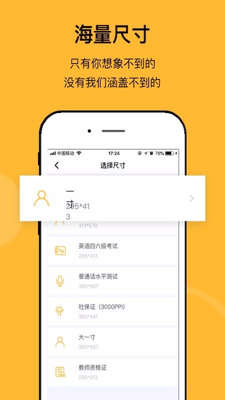 2、多种常用的尺寸内容,其中涵盖教师资格证、社保证以及英语四六级多种规格;