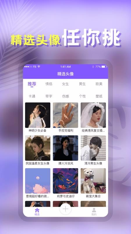 6、汇集海量的网络头像资源,精选页面总有情侣、女生以及男生和壁纸等多种丰富类别;