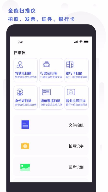 1、设置丰富的扫描证件选择,其中有营业执照扫描、通用票据、行驶证扫描等功能;
