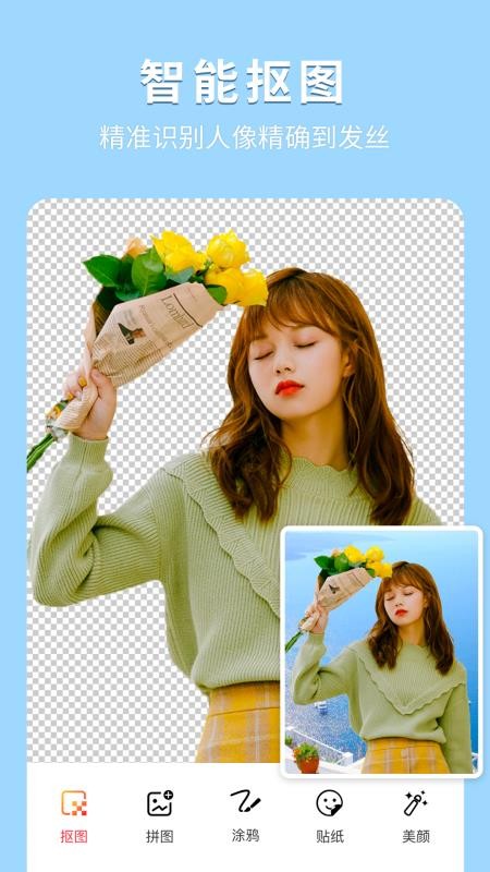 1、智能扣图,可对人像进行精准识别并进行扣图,保留每一分细节;