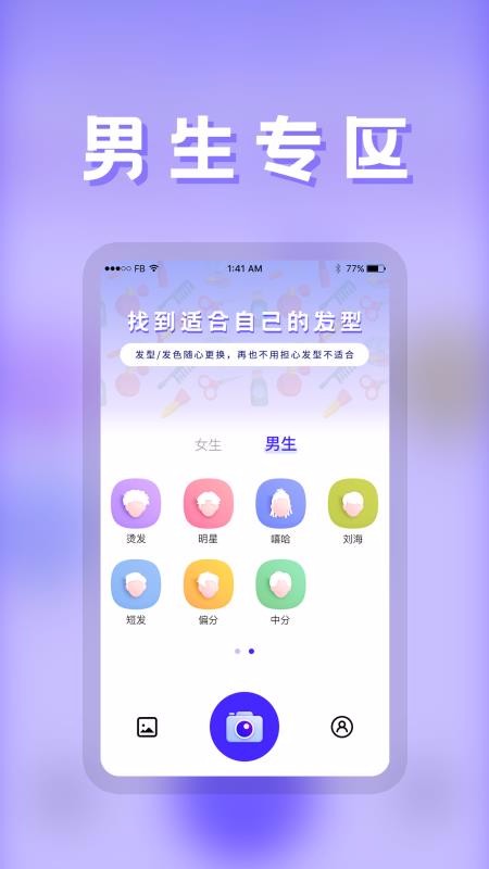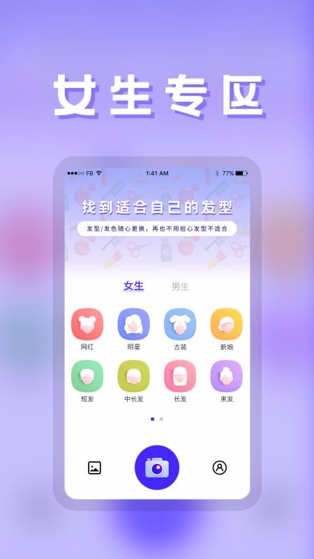发型师是帮助用户预览各种发型的app,可以在该平台中上传自己的个人正脸照片,并选择合适的发型进行调整,让你轻松体验各种风格的发型;选择女生或男生即可查看提供的发型分类,比如在女生专区中包含网红、明星、古装、短发、中长发等,而在男生专区中可以查看烫发、嘻哈、刘海、中分等;拍照或上传照片之后可以进行图片调整,比如美白、编辑、裁剪等,完成之后即可进入下一步;任意的选择发型或发色进行设置,还可以放大图片调节细节,让发型更加紧贴皮肤;一键即可将设置的照片保存在本地,还可以分享该好友查看。