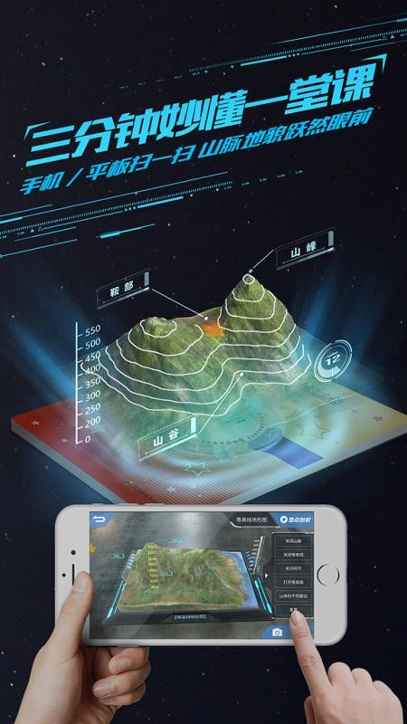 1、使用AR技术将难点进行剖析,了解地理重要知识点;