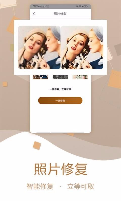 老照片修复是一个照片处理软件,可以将老照片进行上色和修复;只要上传黑白老照片,即可智能检测该照片并进行修复,保存照片本来的面貌,将画质变得更清楚,同时也可以将老照片进行上色;所有上色都是根据老照片的场景自动填充颜色,保证真实性;该软件还可以将老照片的背景进行去糊,保证让你连老照片的背景都可以看清楚;该软件支持修复的老照片包括表面有刮痕、有污渍、模糊看不清的照片,只要上传在该平台,自动为你检测照片的情况并智能补充缺失的部分,让你的老照片还原一开始的模样,同时照片还可以高清保存至手机相册中。