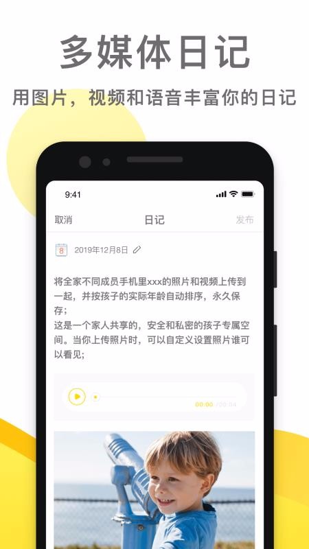 5、可以在软件里面写多媒体日记,利用图片、视频、语音来写日记,让日记的内容更加的丰富;