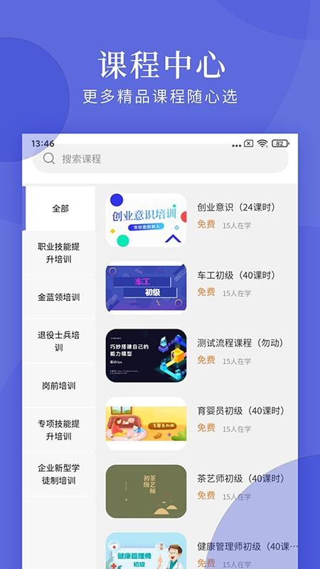 1、在课程中心,查看各种课程分类的信息,搜索查询课程