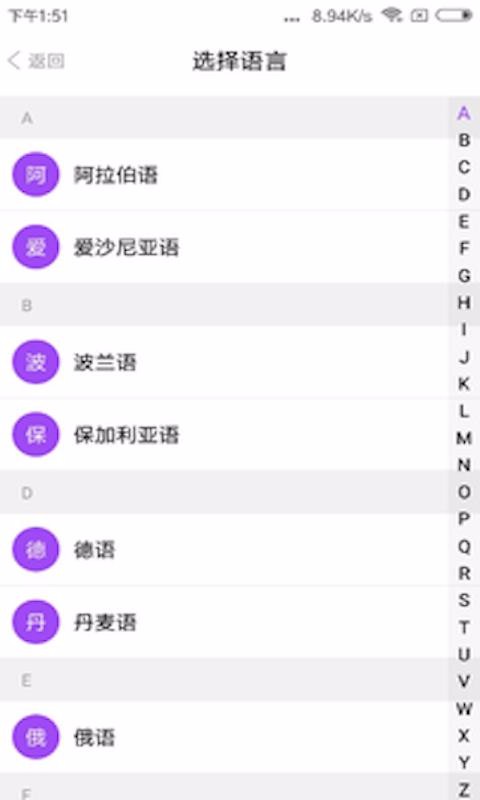 2、便捷的首字母语言筛选条,选择语言页面设置了便捷的首字母筛选方式;