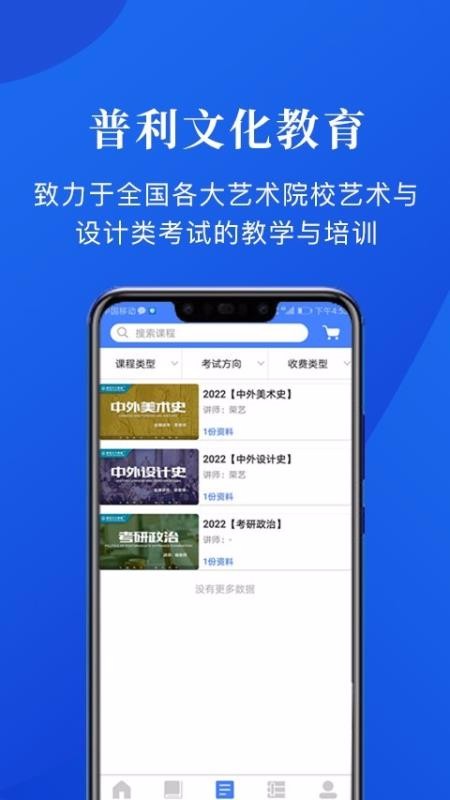 普利文化教育是一个在线教学与培训平台,专注于艺术、设计类考试培训,涵盖的考试范围也丰富,包括了各种高考、考研、考博、教师培训等方面,也结合各种考试类型,为用户推送对应的教学课程和练习内容,让用户可以进行定向学习,轻松完成考试备考;而且该平台的教学形式多样,包括了各种直播课程、点播课程和线下课程,也结合线上和线下的形式,为用户提供丰富的教学服务,并适应了多种学习场景,让用户一站式解决学习需求,也让用户随时随地学习培训,轻松掌握考试内容,还可以获取丰富的学习资料和练习题库。