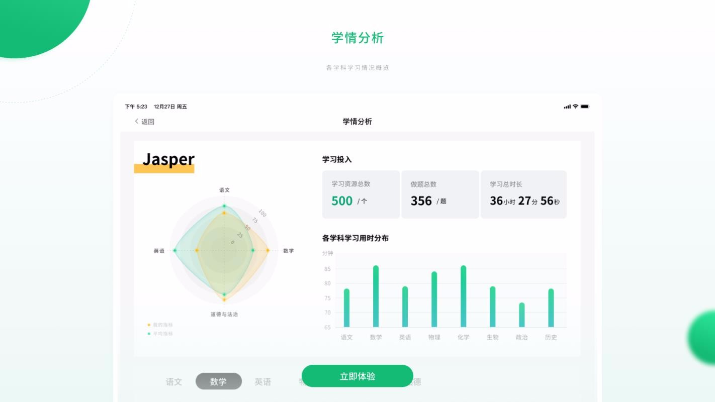 6、一目了然的学情分析,在学情分析中展示多科目的学情掌握对比,还有多种图表展示形式;