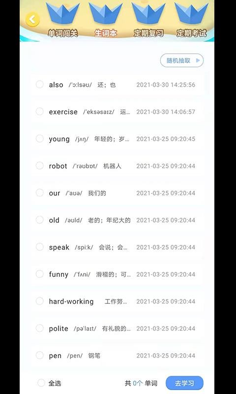 4、设置有单词闯关、生词本、定期复习、定期考试等详细的学习专区,逐步提升记忆水平;