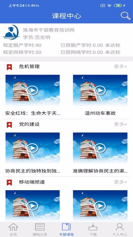 珠海云学习是一个以干部教育学习为主题的软件,针对该教育的特殊性为用户汇总了特备的课程资源,另外还有便捷的考试系统;该软件首页为用户设置了我的课程、课程中心以及考试测评等汇总的服务功能版块,当用户打开软件的时候就能通过这些功能划分轻松找到想要的服务功能,除了该页面的功能专区外,主功能栏也设置了专题课程中心,不仅能从主页进入课程中心,还能直接从主功能栏切换到课程中心,给用户提供选课便捷;在该软件中可以完成一站式的培训学习任务,从通知公告信息接收到课程挑选,再到课程的学习测评都提供了相应的服务。