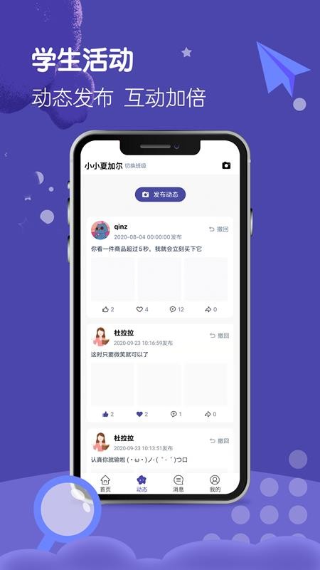 3、进入动态版块,查看学生发布的各种动态内容,和学生在线互动交流