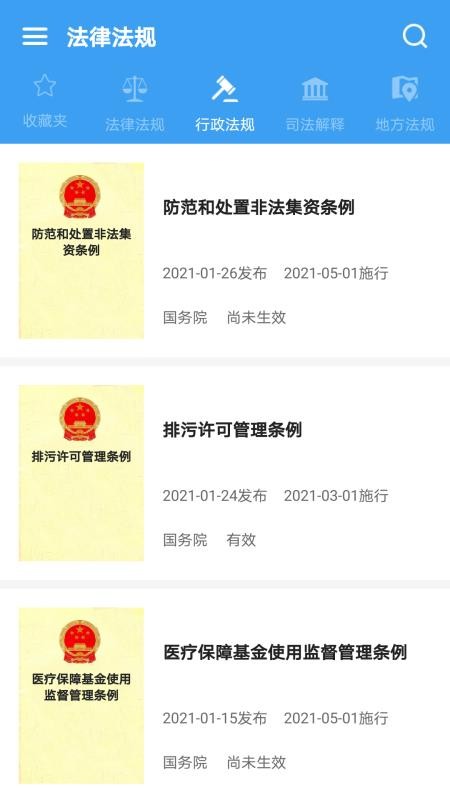 4、在行政法规专区,了解国务院制定和发布的法律条文,阅读有效的法律