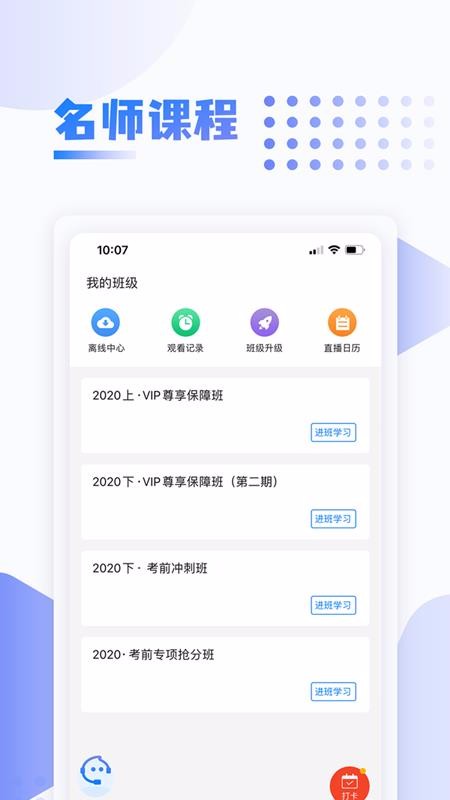 中英考研是一个研究生备考软件,它为广大学生用户提供了线上学习以及考研服务,涵盖在线答疑、名师课程等多种服务项目;该软件为用户汇总了直播日历信息,里面以日历形式汇总了丰富的直播预告内容,从该信息中能清晰看到即将开播的直播课程,有了该预告信息就能让用户提早做好参与直播学习的准备,除了直播课程外,上面还为用户带来可以无限重复播放的录播视频资源,可以为用户带来两种不同的上课体验;这里采用了班级教学模式,专门设置了班级中心,里面有许多的班级学习服务以及班级课程资源,致力于提高用户的学习效率。
