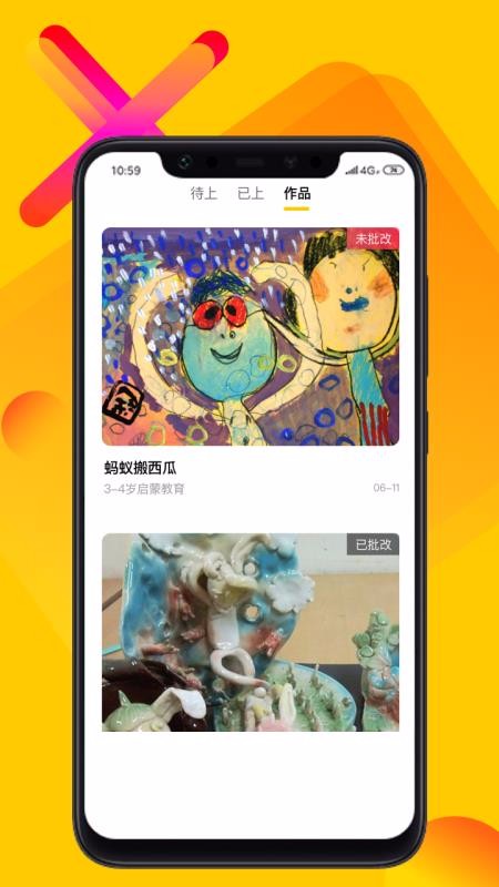 4、提供了作品列表,可以上传作品进行保存,并按照待批改、已批改等状态进行展示;