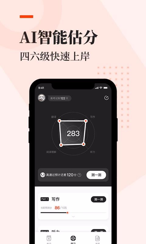 知到四六级是一个英语学习平台,主要面向于英语四六级考试,帮助大学生解决备考问题,也帮助学生更好的完成四六级备考;而且包含的学习内容丰富,涉及了翻译、听力、阅读理解、单词等方面,也通过摸底考、单词卡、备考视频、在线题库等形式进行推送,可以让用户享受科学的备考体系,也全方位的完成四六级学习,掌握更加丰富的考试内容;所以,想要更好的通过四六级考试,就可以下载该软件进行学习和备考,让你随时随地背单词、练习听力、做真题,全面掌握考试内容,也助力用户高分上岸,轻松通过四六级考试。